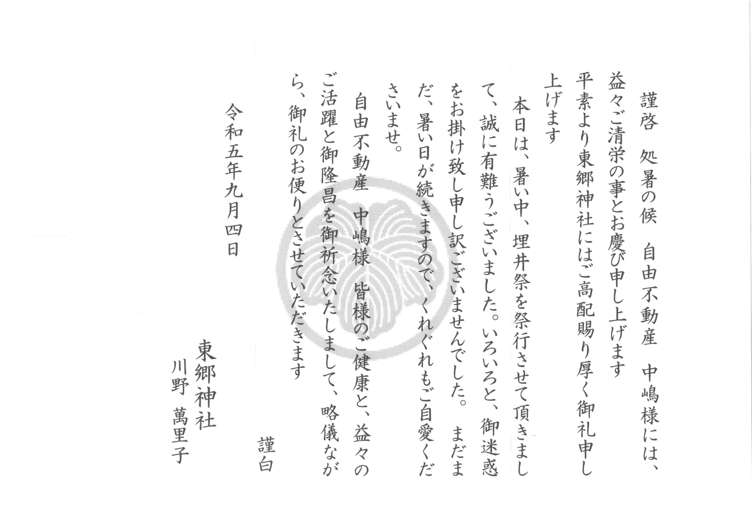 お礼状とお菓子を神社様から頂くのは
