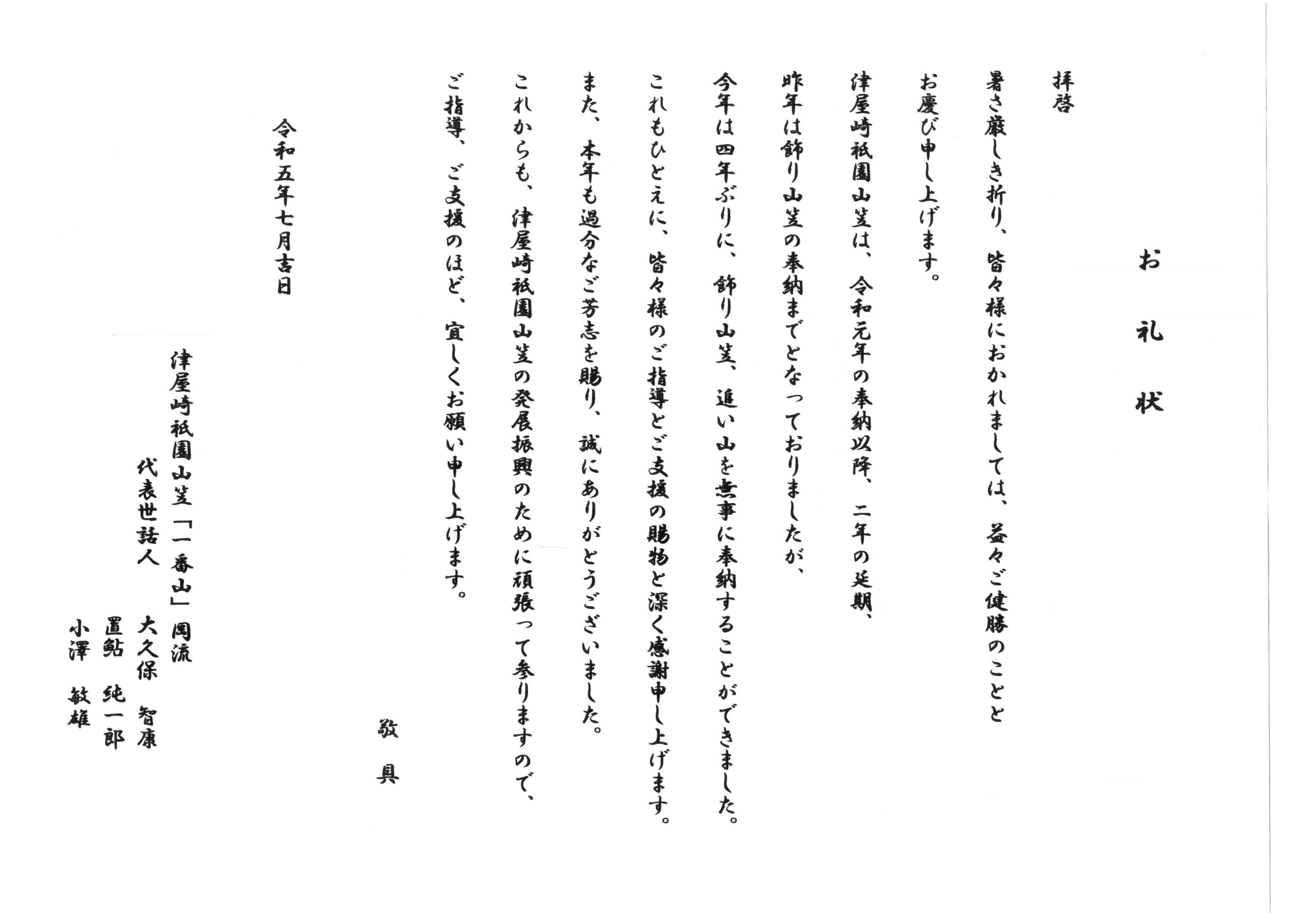 山笠タオルとお礼状を頂き